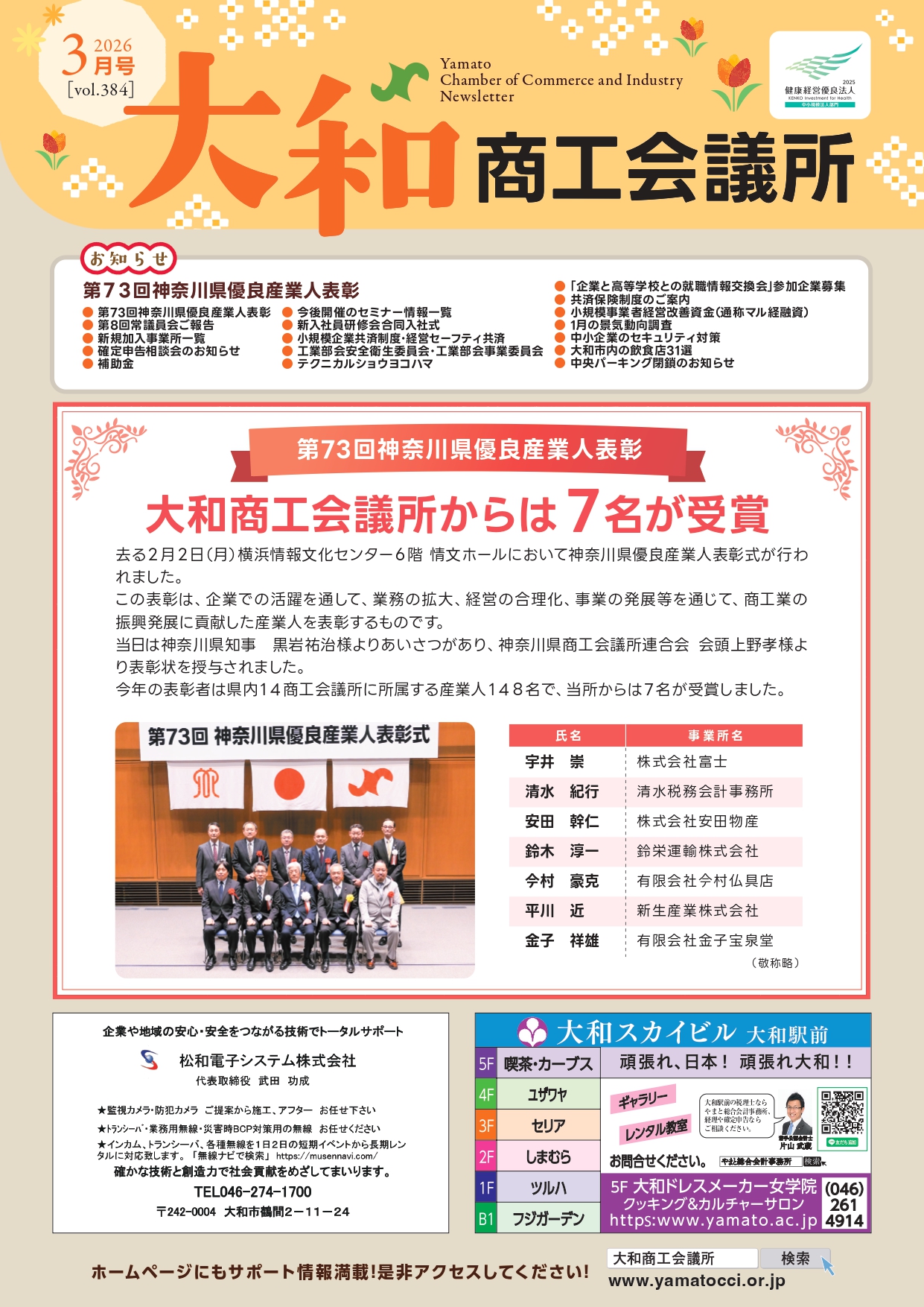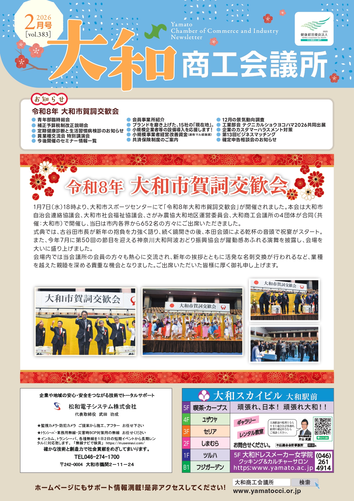2026.2Vol.383 令和8年 大和市賀詞交歓会、青年部臨時総会、補正予算税制改正説明会、定期健康診断と生活習慣病健診のお知らせ、異業種交流会 特別講演会、今後開催のセミナー情報一覧、会員事業所紹介、ブランドを磨き上げた、15社の「現在地」、小規模企業者等の設備導入を応援します!、小規模事業者経営改善資金(通称マル経融資)、共済保険制度のご案内、12月の景気動向調査、工業部会 テクニカルショウヨコハマ2026共同出店、企業のカスタマーハラスメント対策、確定申告相談会のお知らせ