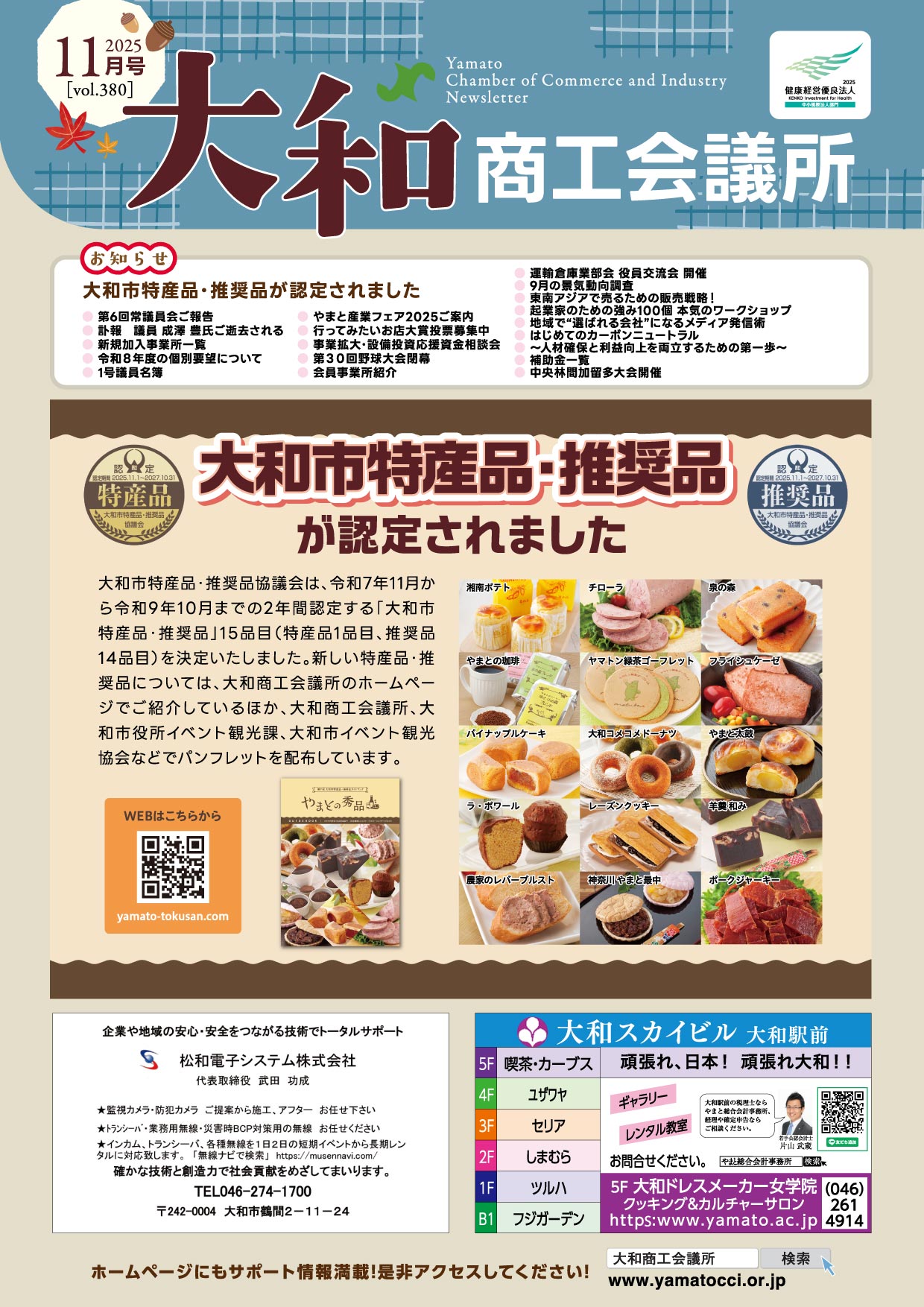 2025.11Vol.380 大和市特産品・推奨品が認定されました、第6回常議員会ご報告、訃報 議員 成澤 豊氏ご逝去される、新規加入事業所一覧、令和8年度の個別要望について、1号議員名簿、やまと産業フェア2025ご案内、行ってみたいお店大賞投票募集中、事業拡大・設備投資応援資金相談会、第30回野球大会閉幕、会員事業所紹介、運輸倉庫業部会 役員交流会 開催、9月の景気動向調査、経営に役立つ5つのセミナー情報、補助金情報一覧、中央林間加留多大会開催
